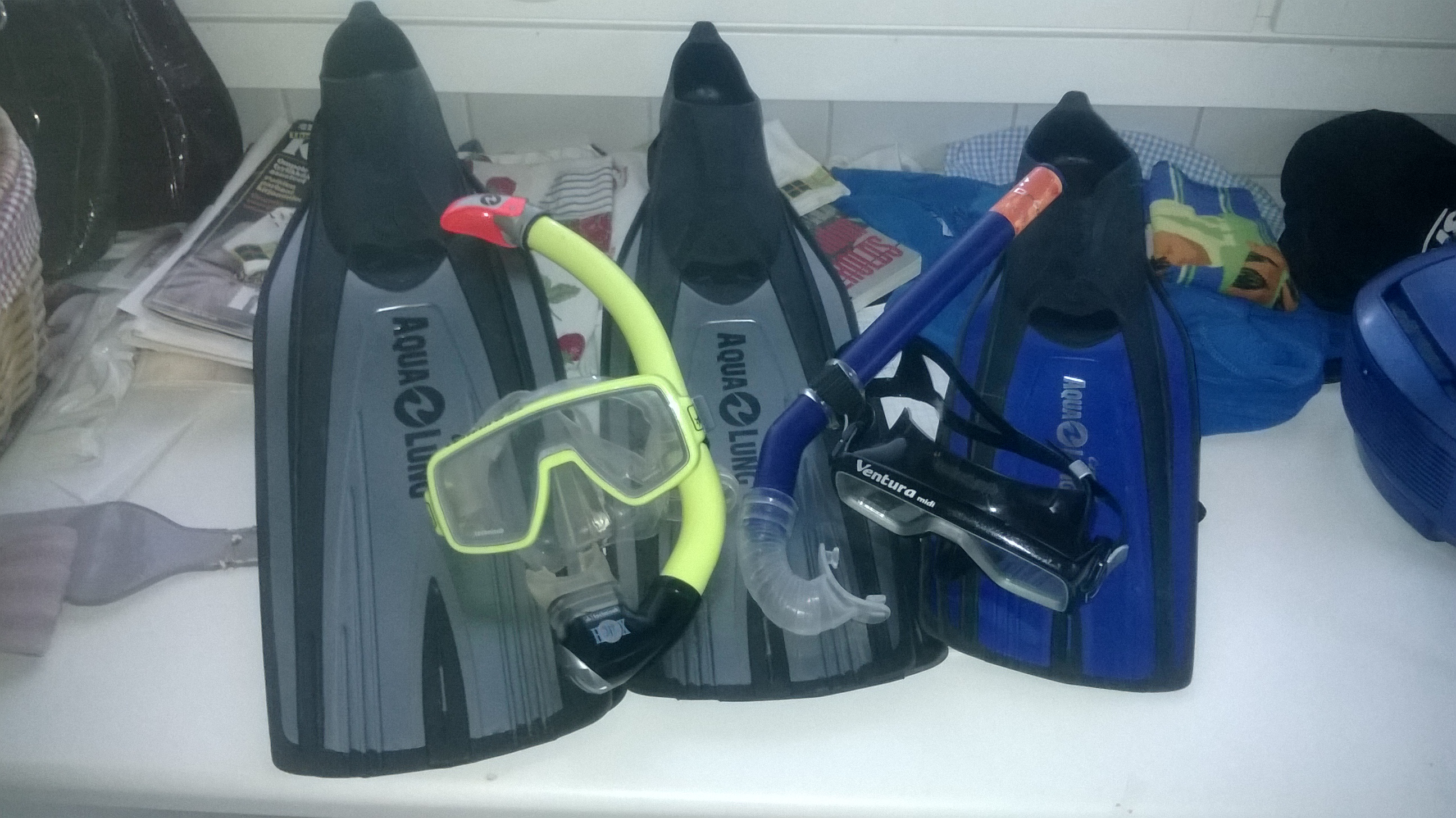 Räpylät: Aqualung Caravelle, umpikanta, koko 34 - 35 (sininen) sekä koot 36 - 37 ja 40 - 41 (harmaa), hintaan 25 €/pari